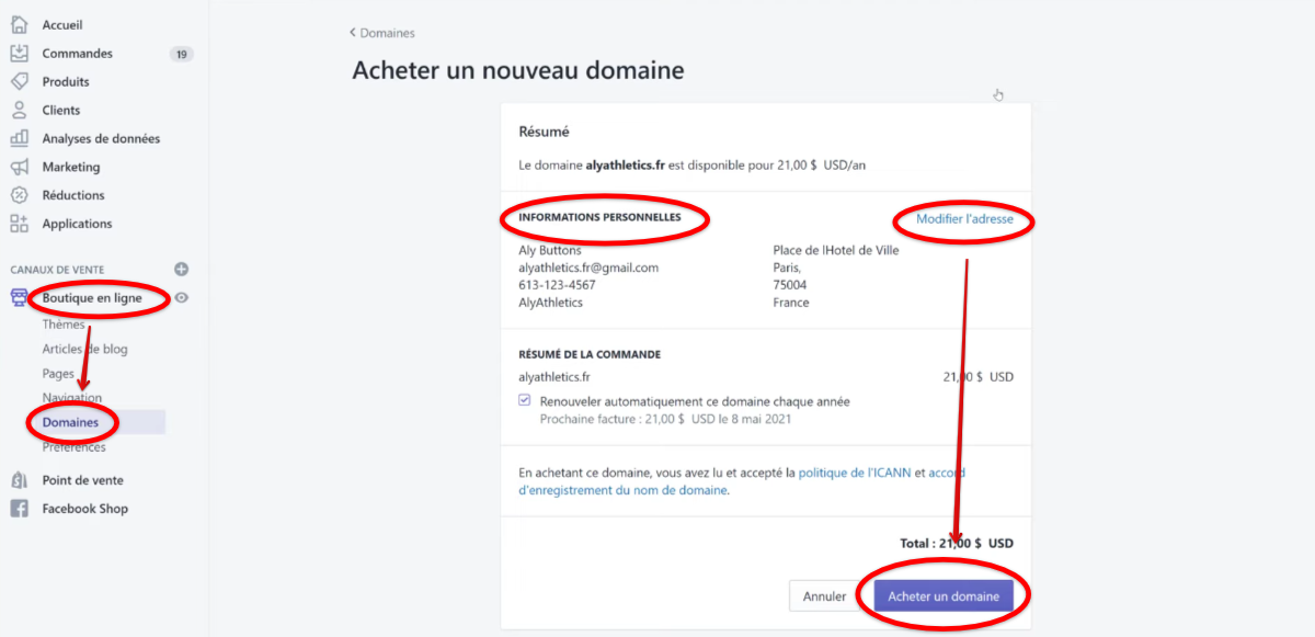 Pour ce faire, rendez-vous sur votre interface administrateur > Boutique en ligne > Domaines. Suivez ensuite les instructions pour ajouter votre domaine puis validez votre choix. Sur la page suivante, rendez-vous dans la rubrique Informations personnelles puis cliquez sur le lien Modifier l’adresse. Une fois votre adresse postale modifiée sans inclure de caractères spéciaux, cliquez sur le bouton Acheter un domaine, comme indiqué sur cette capture d’écran :