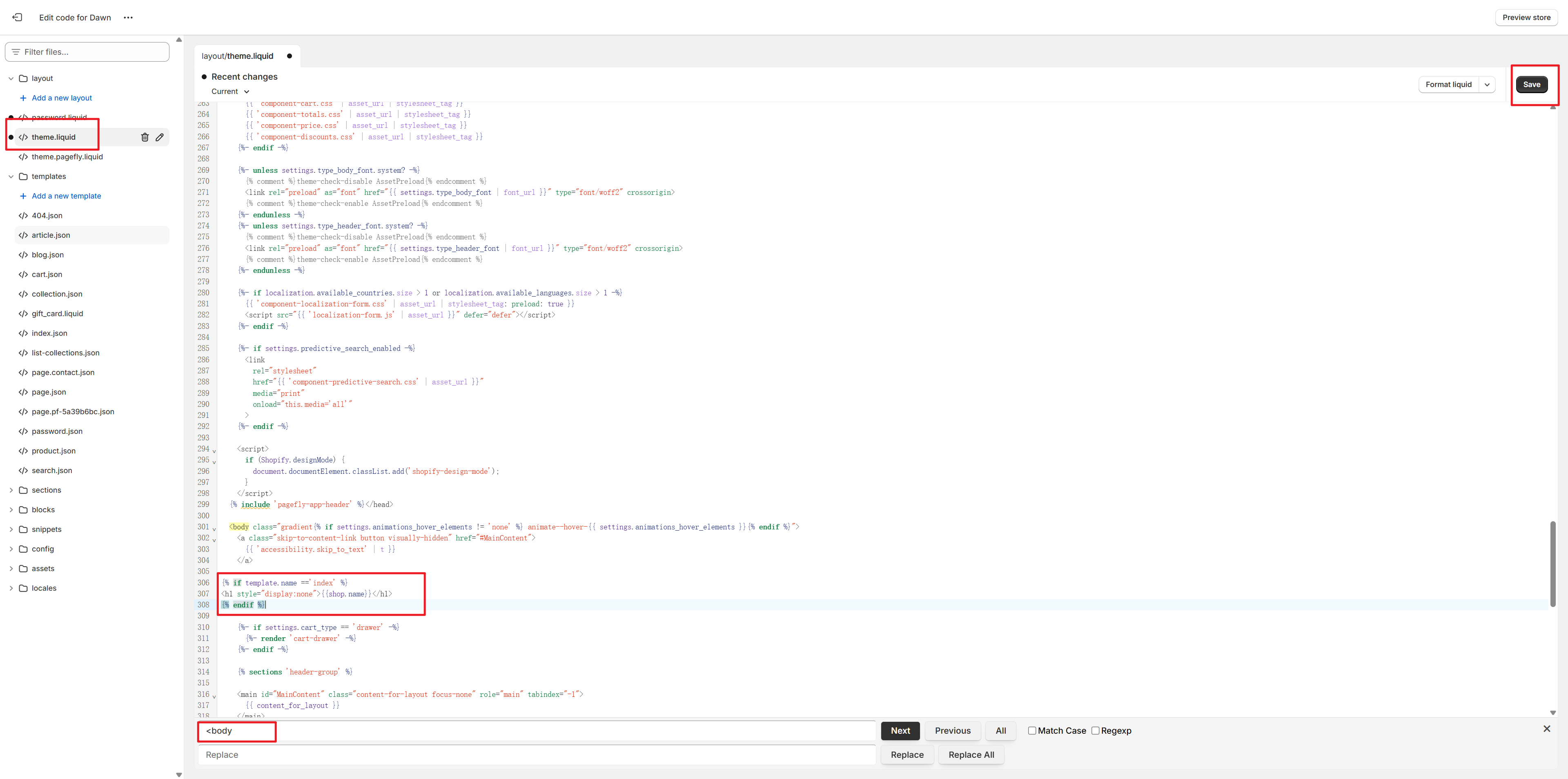 For H1 tags. You can directly use my shared code below and add it between and by pressing Ctrl+F to search “<body” in theme.liquid file after accessing Shopify backend by clicking Online Store-Themes-three dots near Customize button-Edit code to find it.