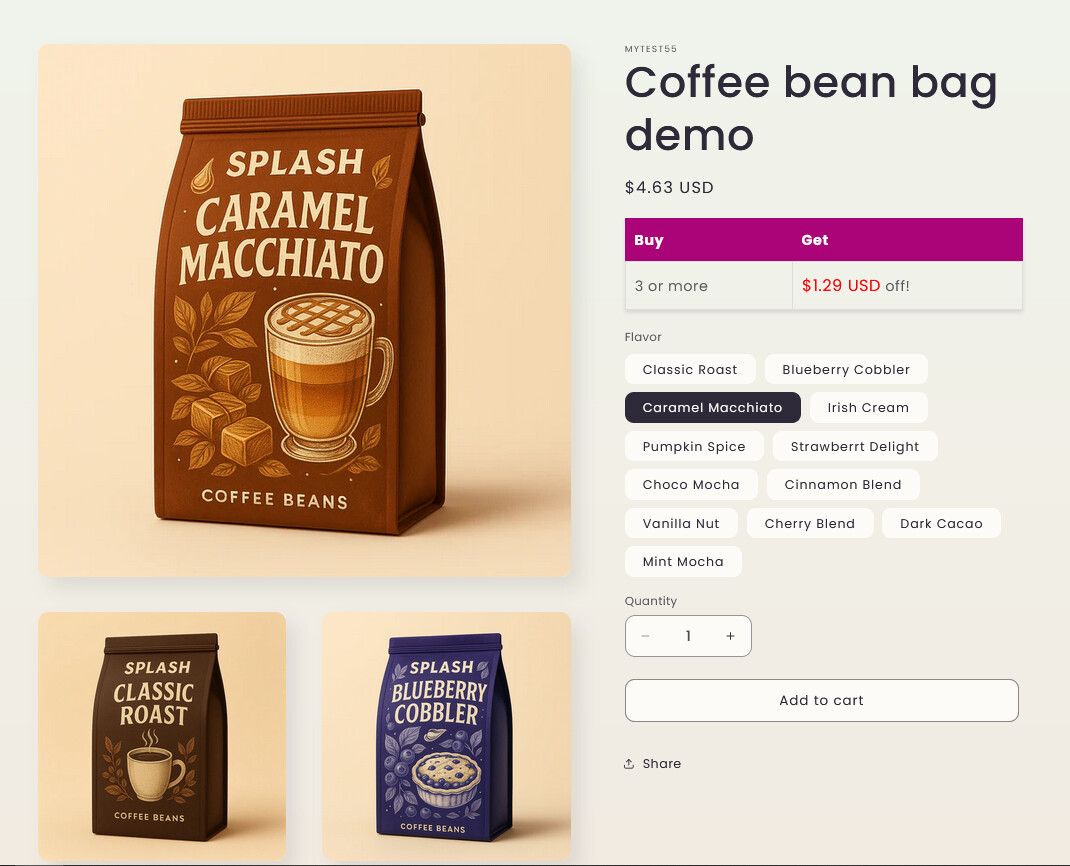 For example, if you’d like to offer a discount on purchases of more than three quantities of your Halloween-special coffee bean bag in two specific flavors to clear out stock, you can do so easily. Customers selecting those particular variants will see the discounted price, while other variants will remain at the regular price.