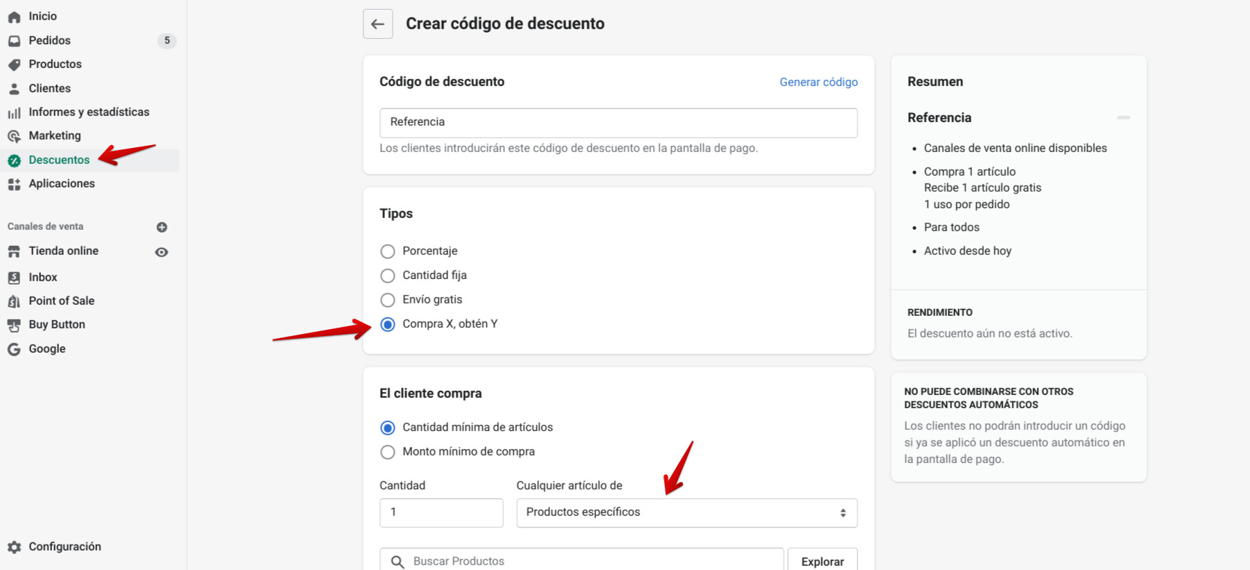 Entra en la sección “Descuentos” en la columna de menú izquierda, arriba a la derecha, haz click en “crear descuento” y elige la opción de crear un código de descuento (este código podrás luego enviarlo a los clientes que desees).