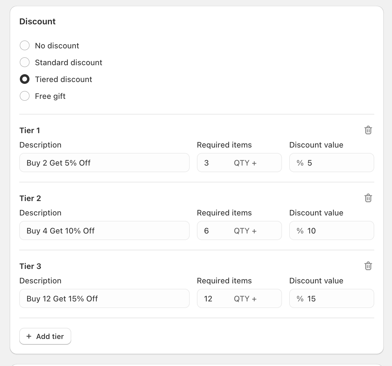 This offer is called ‘volume discount’, the more shoppers buy, the more they save (you can also choose BOGO offer and customize it)