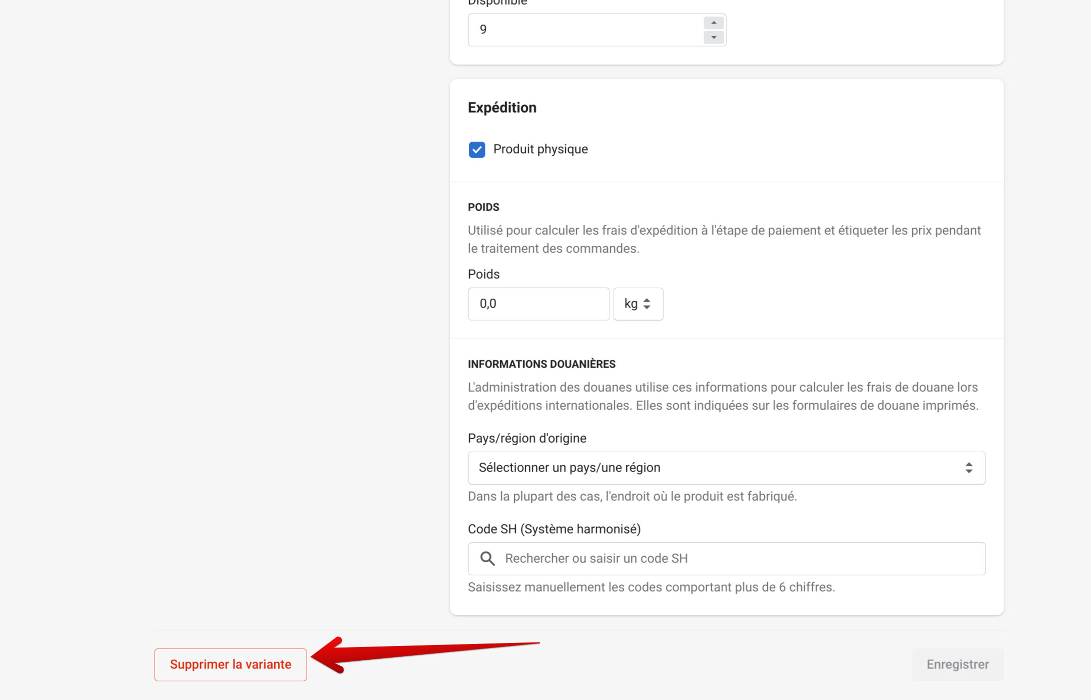 Merci beaucoup pour les captures d’écran. Avez-vous été en mesure de supprimer votre variante si vous avez qu’une seule variante dans votre fiche de produit ? Si vous cliquez sur la variante comme ici :