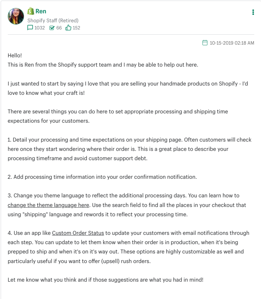 Soprattutto la risposta di Ren suggerisce o di aggiungere una nota esterna nella Home, o di integrare la piattaforma con una app di terze parti come Custom Order Status o di modificare il codice del tema. Se non sei un esperto in coding potresti ingaggiare uno dei nostri Esperti Shopify (qui come fare).