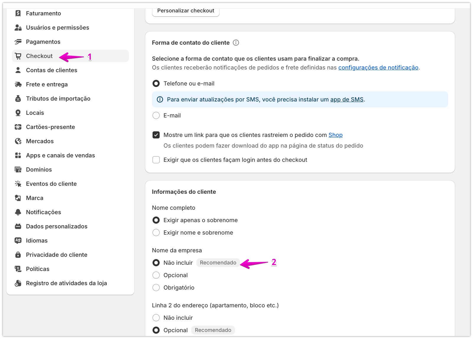 Além disso, você pode solicitar a remoção total desse campo da loja do seu cliente. No entanto, é muito importante entender que esse campo não pode ser excluído somente para clientes brasileiros. Se solicitar a exclusão, isso se aplicará a todos os campos de país (número de identificação fiscal brasileiro, número de identificação de residente chinês, código alfandegário pessoal sul-coreano e código fiscal italiano). Portanto, se seu cliente vende ou pretende vender para esses países, precisa ter em mente que não poderá mais coletar informações fiscais através da Shopify. Para solicitar isso, entre em contato com nosso suporte através da Central de Atendimento por mensagem (e-mail) ou chat 24 horas. Ao acessar nosso suporte pela Central de Atendimento, você irá encontrar as ferramentas para te autenticar como usuário da conta e assim poderemos fornecer informações/modificar o que for preciso em segurança.