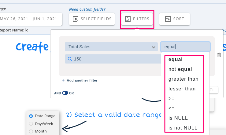 We can show the total sales amount for each order & can filter the sales value as you wish. Further, you can choose the date range for the last 30, 60, 90 days & a custom date range also available.