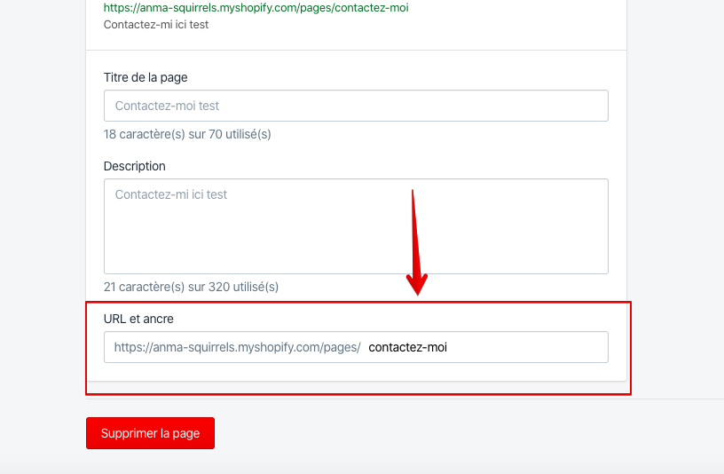 La seule partie que vous pouvez changer est l’ancre de l’URL d’un produit, page ou d’une collection. Pour cela, allez dans vos pages puis cliquez sur la page que vous voulez modifier. Descendez puis cliquez sur “modifier le référencement naturel d’un site web”