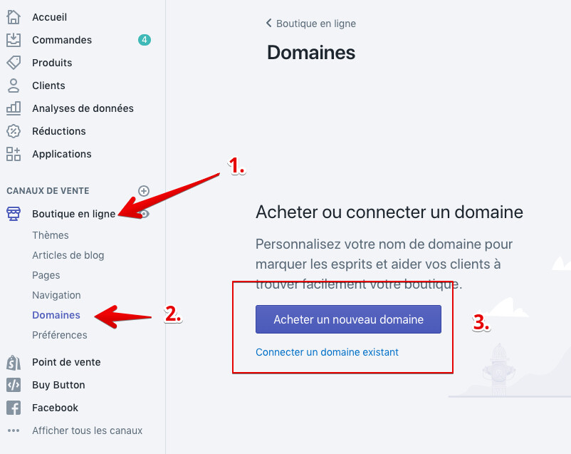 Vous pouvez tout à fait acheter votre domaine chez Shopify à partir de votre admin. Allez simplement dans “Boutique en ligne” > Domaines puis cliquez sur “Acheter un nouveau domaine”.