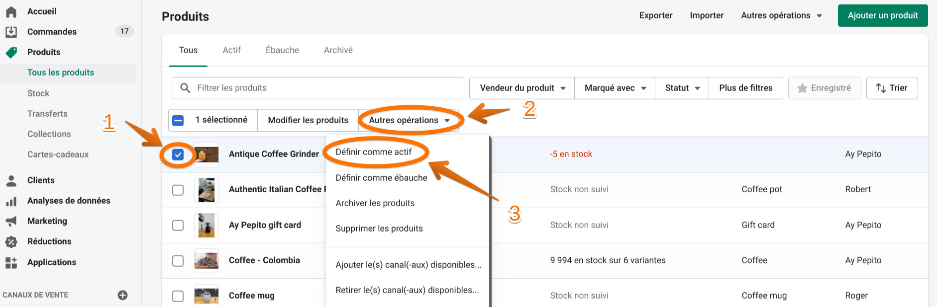 Toutefois, si votre produit n’apparaît pas dans la liste, cela pourrait être dû à plusieurs facteurs. Je vous inviterais dans un premier temps à vérifier que votre produit est bien actif. Pour ce faire, rendez-vous dans Produits puis regardez la colonne Statut :