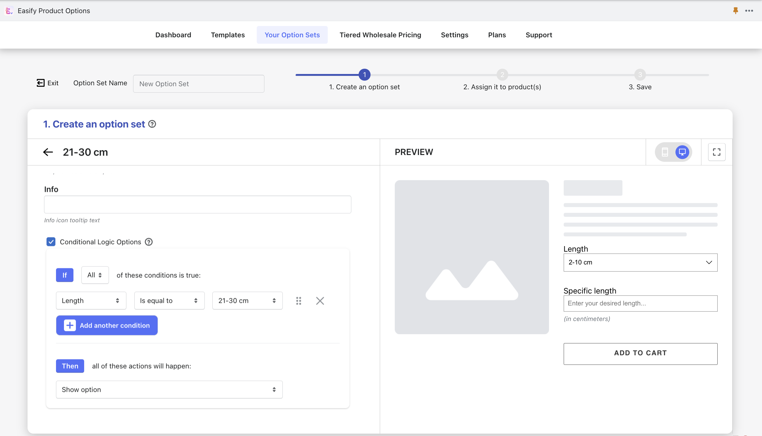Lastly, create an option for customers to enter the exact number of centimeters if they select the 21-30cm range. Utilize the Number text box option type and set up conditional logic to display this option only when the 21-30cm range is selected.