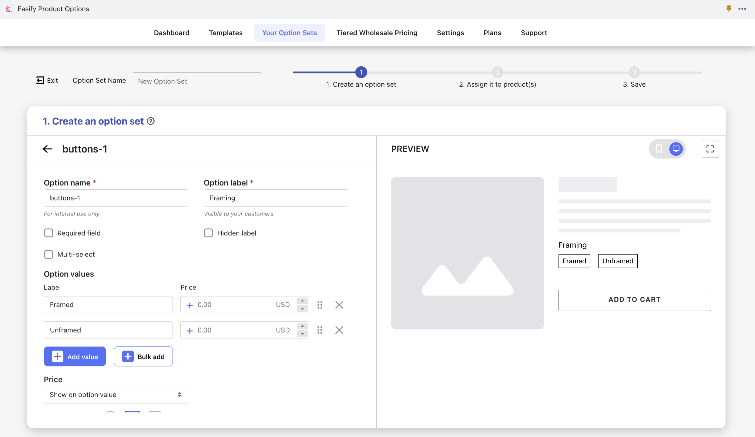 - Create an option that allows customers to choose between “Framed” or “Unframed” options. You can use Buttons, Radio Buttons, or Dropdown option input types to present this choice.