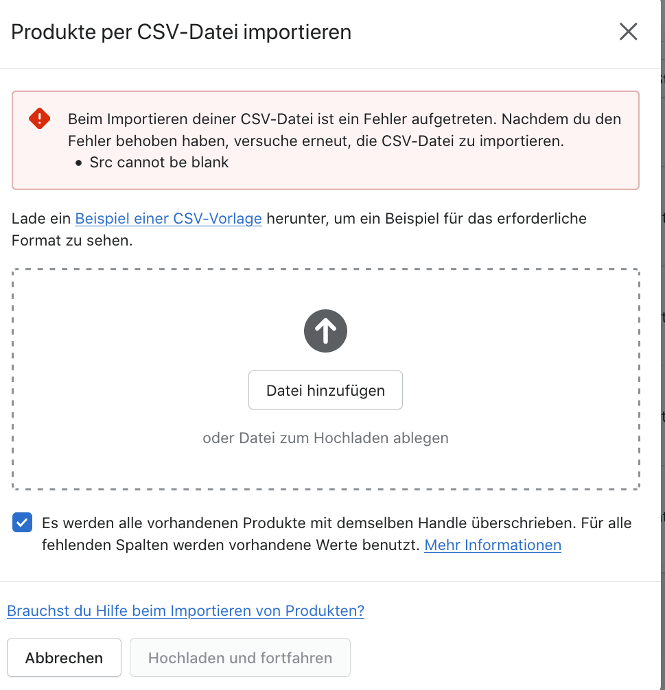 für meinen Shop habe ich die Probe CSV Datei von Shopify verwendet, die Shopify Produkte entfernt, meine Produkte eingefügt, sie auf meinen Mac heruntergeladen und mit dem Google Chrome Browser auf Shopify hochgeladen.
