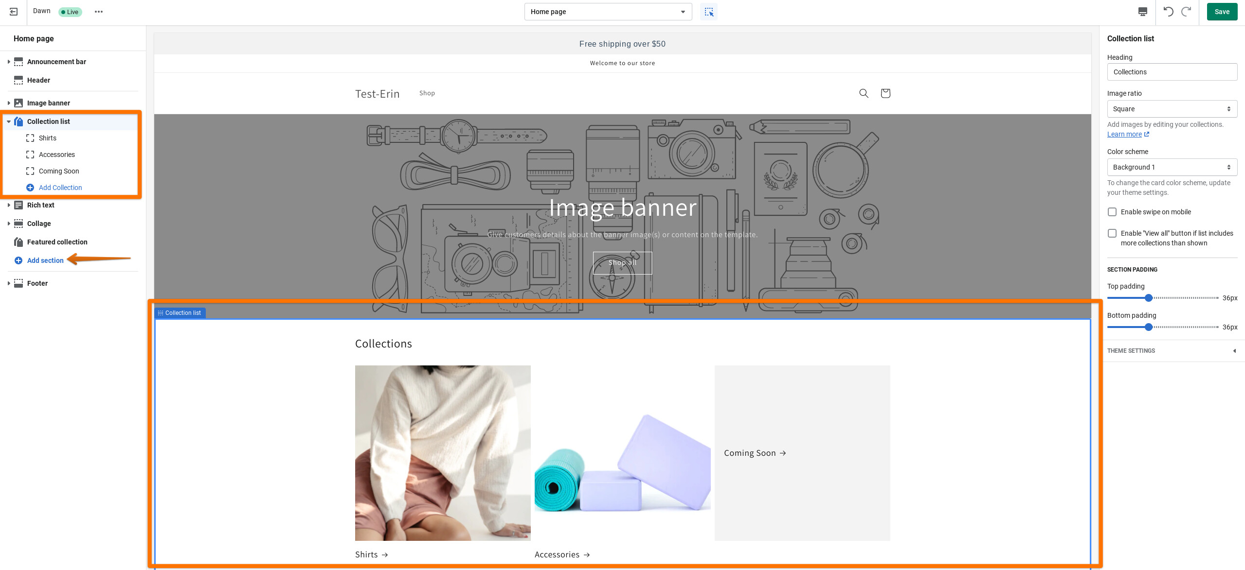 If you’d like to display your collections more similar to the example you shared I would recommend using a Collection list section instead. You can add this section by going into your Theme Editor and clicking Add section > Collection List. To get into your Theme Editor you will want to go to Online store > Themes > Customize (next to the the theme you are working with - Dawn in this case). I’ve included an example of what this section can look like below.