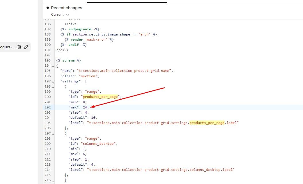 Hi everyone, I also wanted to increase the number of articles per page from 24 to another number, but following this guide I cannot find the line containing the number 24 in the path indicated “main-collection-product-grid.liquid”, but I find it in the “collection.json” section which however is not editable. Do you know if there was an update that removed the ability to add more products to pages using the DOWN theme? Thank you