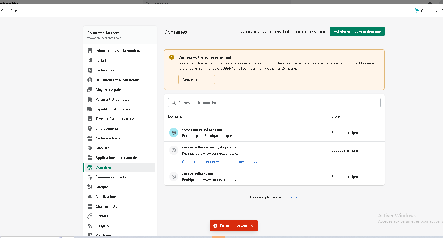 Un message d’erreur apparait quand je veut vérifier mon adresse mail pour mon nom de domaine :
