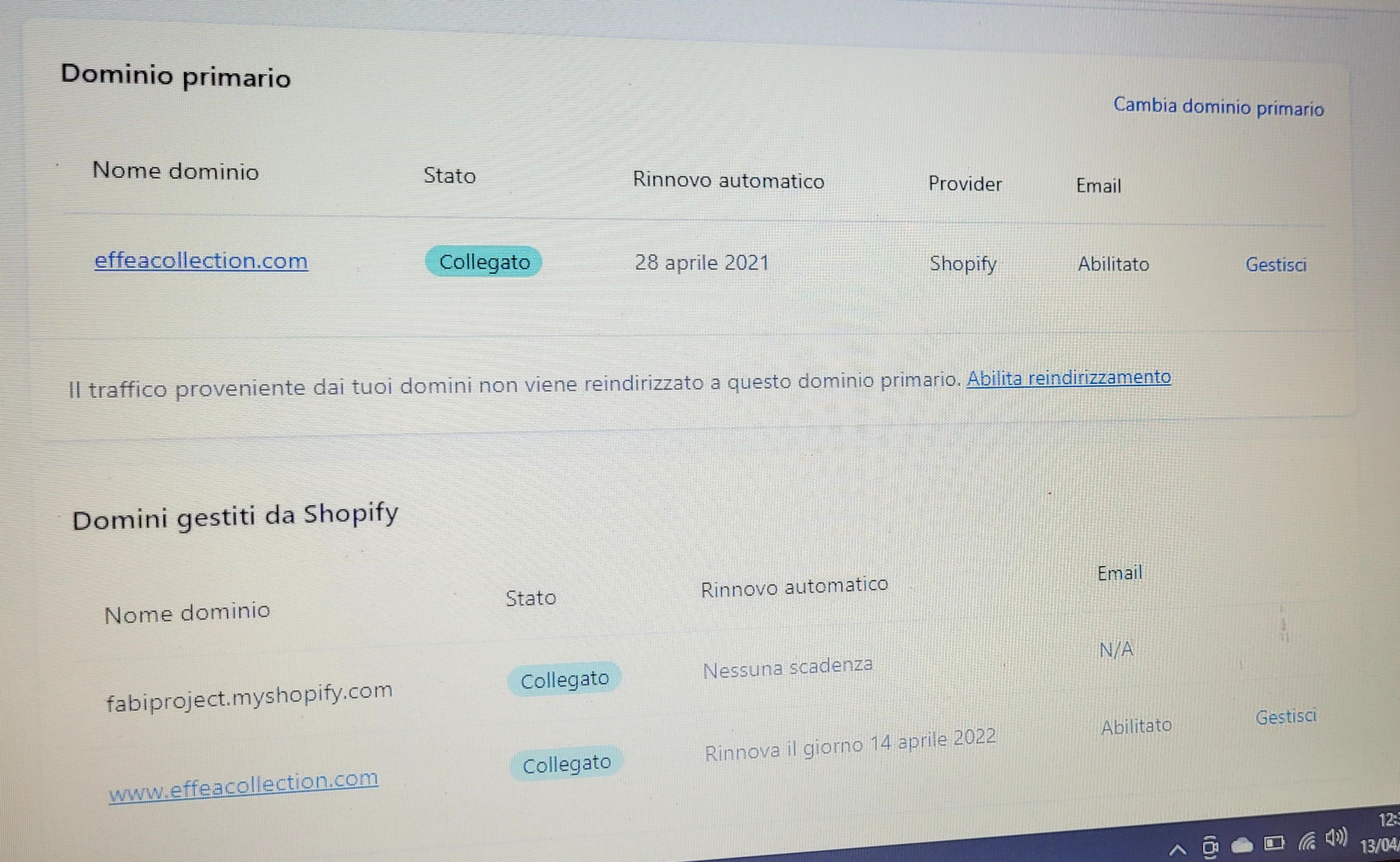 Ciao Sofia! Ti allego screen per una tua comprensione…al momento l’unico dominio collegato a Facebook è www.effeacollection.com. Ed è anche il dominio primario in Shopify.