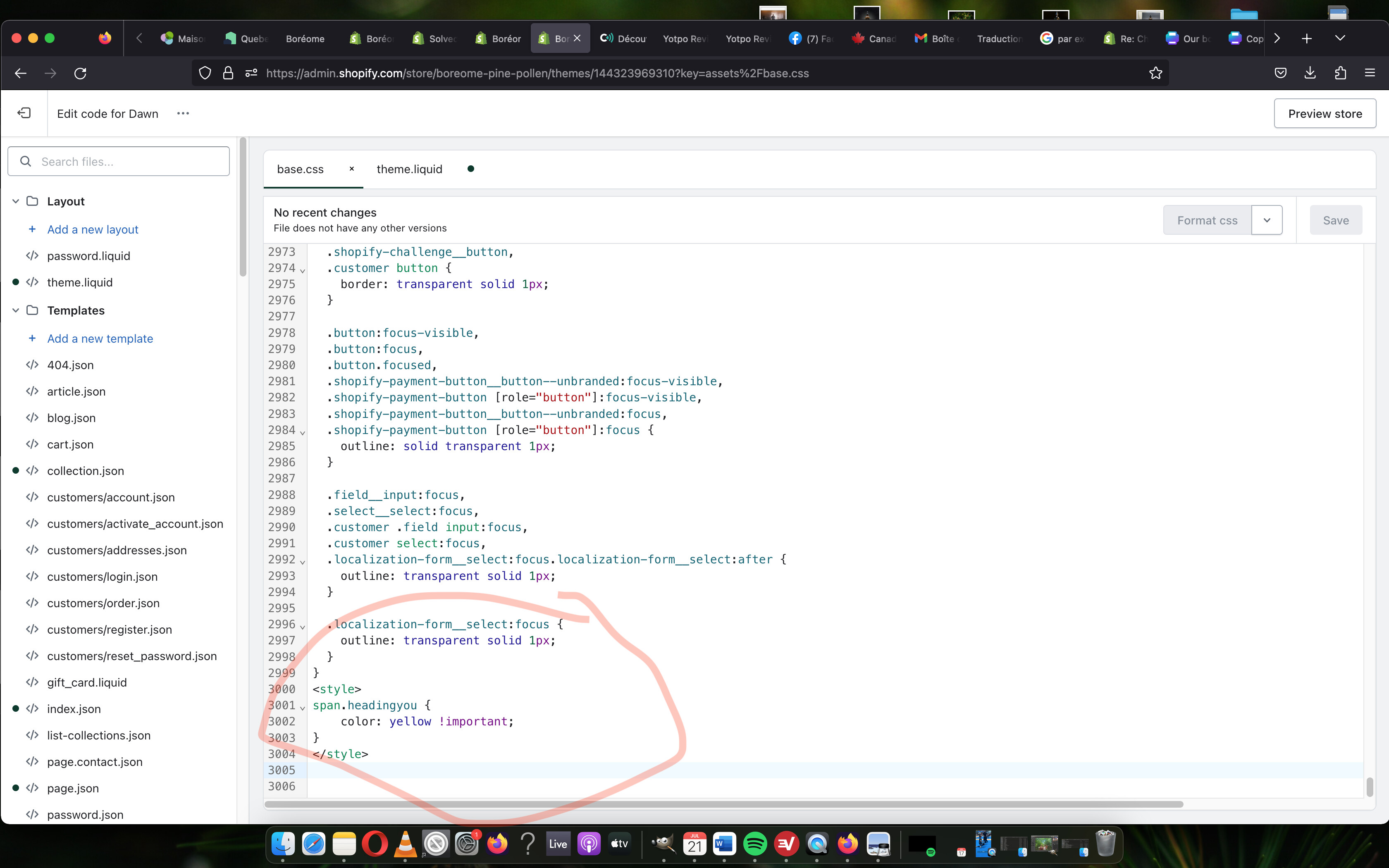 In the “Assets” folder, click on “base.css, style.css or theme.css” file, depending on which file your theme uses to store its CSS styles. At the bottom of the file, add the following CSS code: