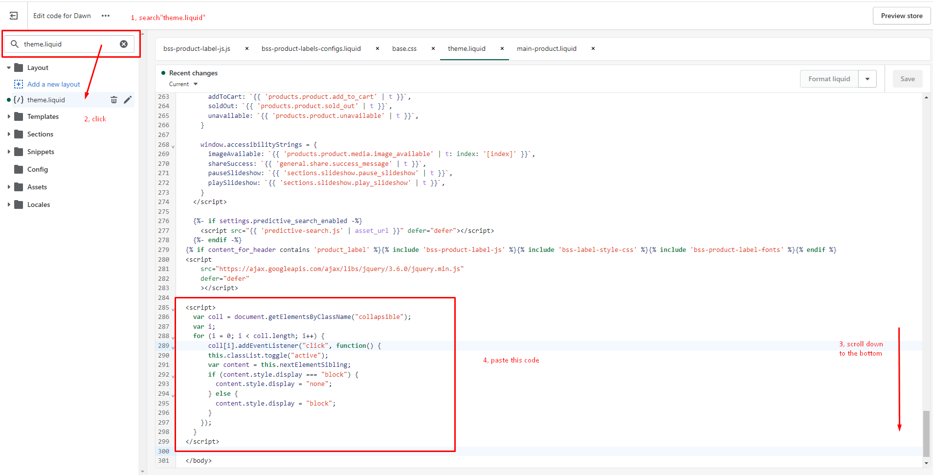 I’m looking for a code that can help me with the collapsable description for each of my products all in once.