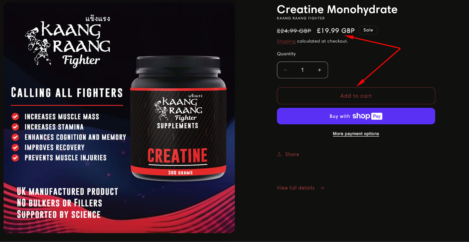 - Update your website title and favicon: This is one of the first things that your visitors see at first sight as they enter your store. Here, I suggest you change your favicon into a visible version of your brand logo as it currently looks a bit hard to see clearly. Additionally, make sure you include your brand name somewhere in the website title, too, like this example: âKaang Raang | Creatine Designed For Fightersâ.