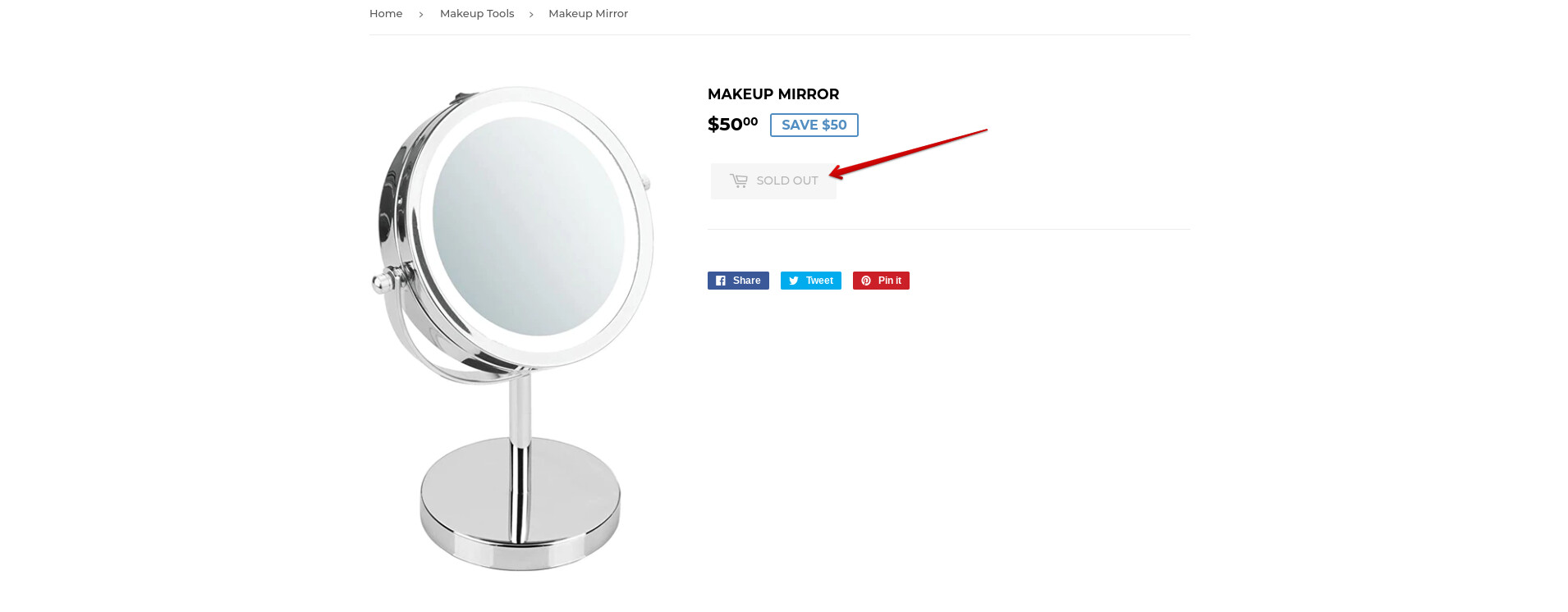 Below is an example in my test store of a product’s inventory set to 0 which displays as sold out on the storefront.