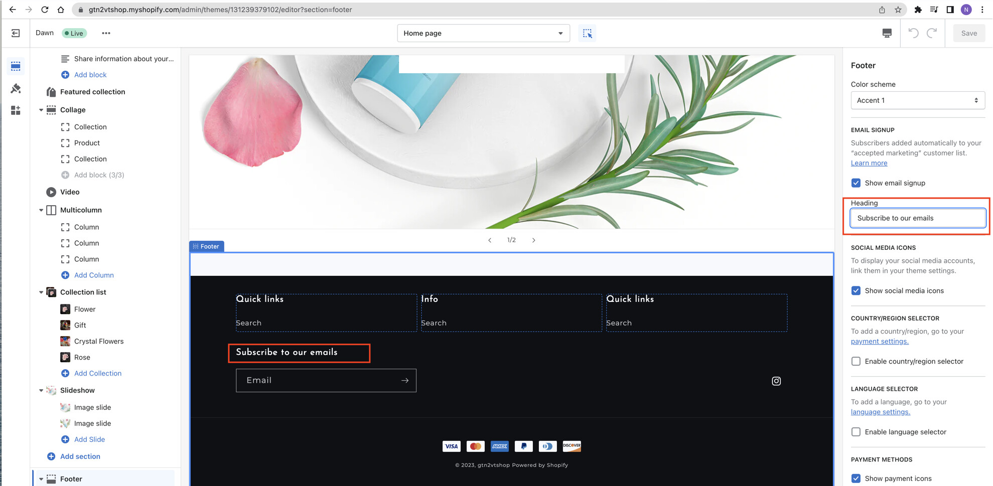 Thank you, but unfortunately I’m not trying to edit my website, I’m working on my email marketing campaigns (sent to customers from shopify) and I’m trying to edit the footer of my emails, not my website.