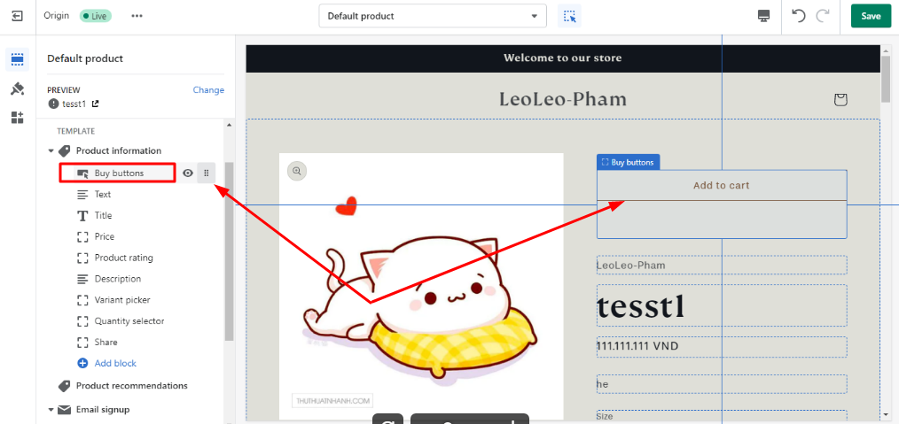 Please go to Customize > Products > Default product > Product information > Buy buttons. You just need to drag it to the position you want, it will display fine: