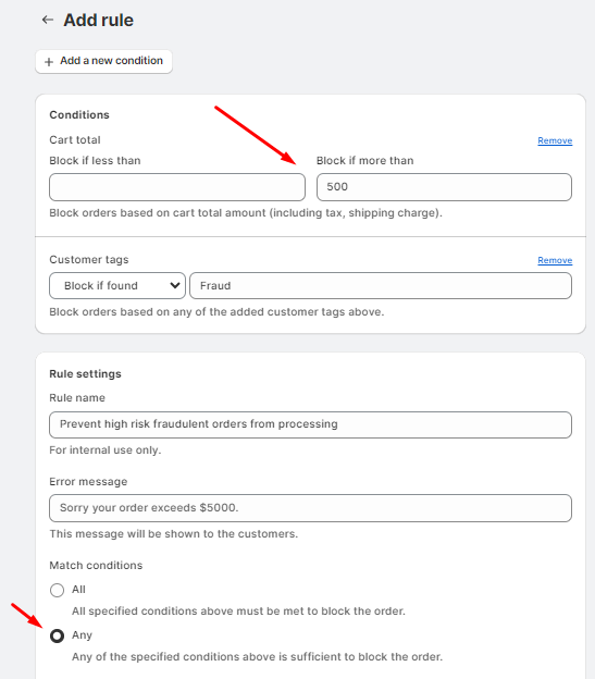 Click “Add a new condition” again and select the “Customer tags”. Then you can add a tag like “Fraud” if you already have a list of fraud customers.