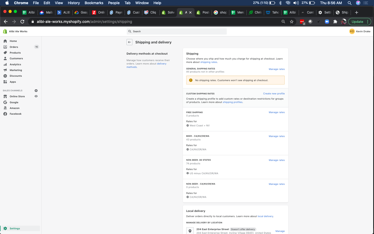 I own a brewery and have a relatively new shopify store where we sell both beer and merchandise. Due to restrictive beer shipping laws, I can only ship directly to customers in CA/NV/OR/WA. But I want to be able to ship merchandise and non-beer items to customers in all 50 US states. I currently have my shipping configured in General Shipping Rates into a single zone (CA/NV/OR/WA) with two different flat rates, one for beer (over 2 lbs = $15) and one for merch (under 2 lbs = $5.99). This has worked well since customers often combine beer and merch, and Shopify automatically charges the higher of the two flat rates based on weight. If I configure another shipping zone in General Shipping Rates, it cannot include any states currently selected.