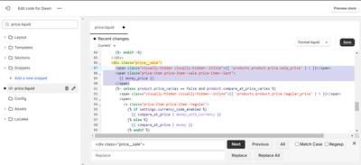 Go to “price.liquid” and search "{{ ‘products.product.price.sale_price’ | t }} ". Select this code and below code as shown in below “Before” screenshot and paste the codes above next to the line “