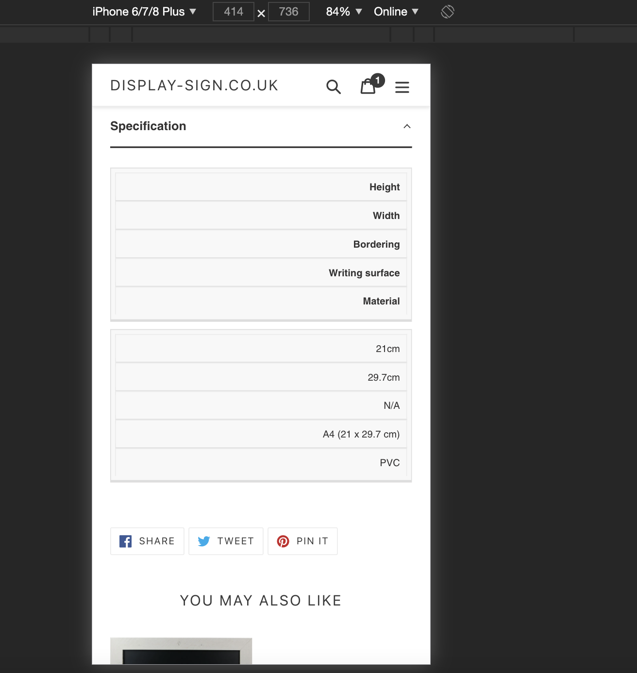 I have created a table which features on all products pages. However, when you view the products table on a mobile and tablet device, the formatting looks quite odd with not all of the table visible and the header font sizes doesn’t look good (see screenshot showing difference between desktop + mobile/tablet view).