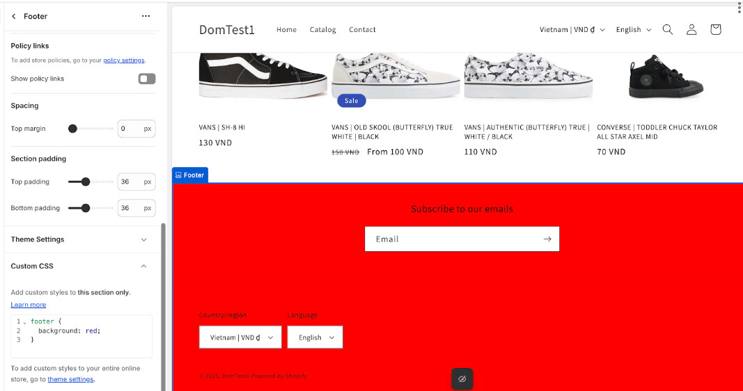 Shopify Admin → Online Store → Customize → Footer → Custom CSS,