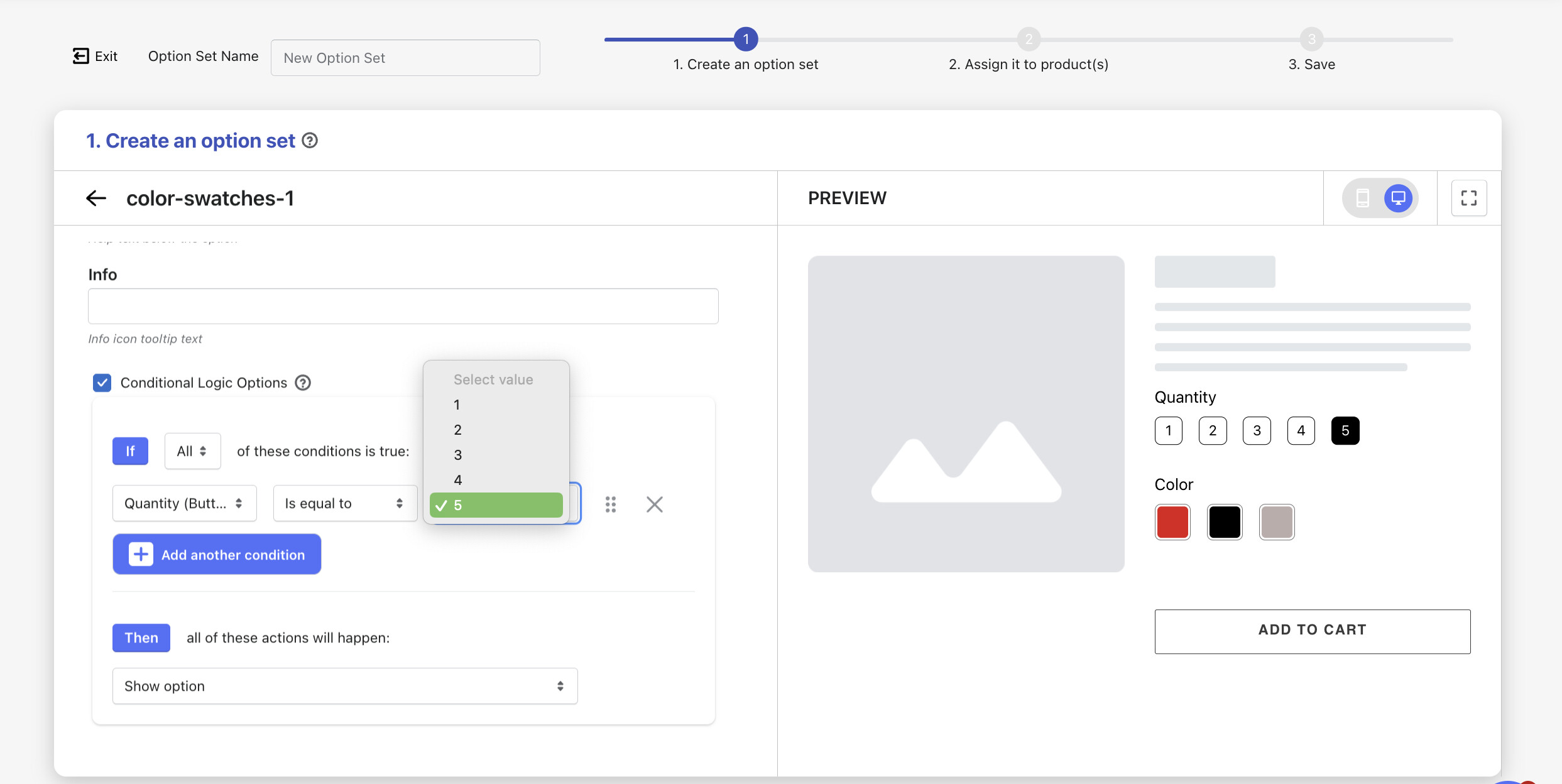 - Next, add another option that allows customers to choose Colors, but only after they have selected “5” in the previous Quantity Dropdown. You can do this using the Color Swatches (or other proper option types) and Conditional Logic feature provided by the app.