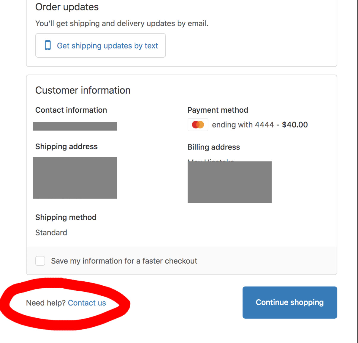 On my order confirmation screen there’s a ‘contact us’ link at the bottom which I’d like to remove. I circled in red in the image below!