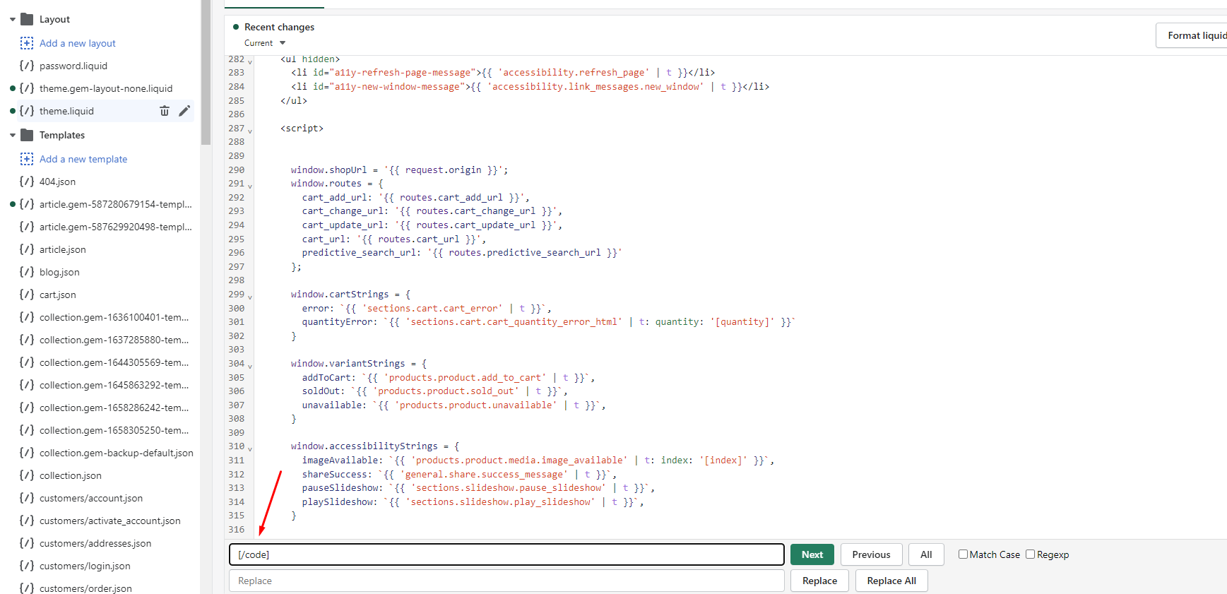 It looks like the text is coming from a code snippet that has been added to your website’s footer. If you’re comfortable with coding, you can attempt to remove this yourself by following the instructions below. A reminder that before making any changes to your theme’s code, you’ll need to firstly duplicate your current theme using the steps listed in this guide so that you can revert back to its current version in case you need to. Once that’s done, you can proceed with the steps below to remove the [code] [/code] text from your store’s footer:
