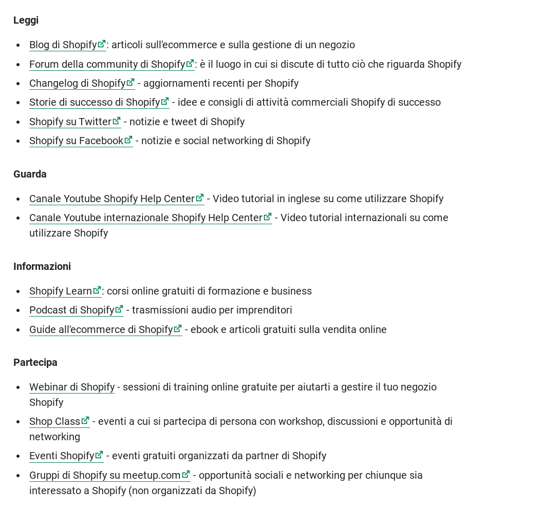 In generale, il nostro supporto e le nostre risorse sono un ottimo punto di riferimento per ricevere assistenza, idee, ispirazioni e incrementare la dimistichezza con Shopify.