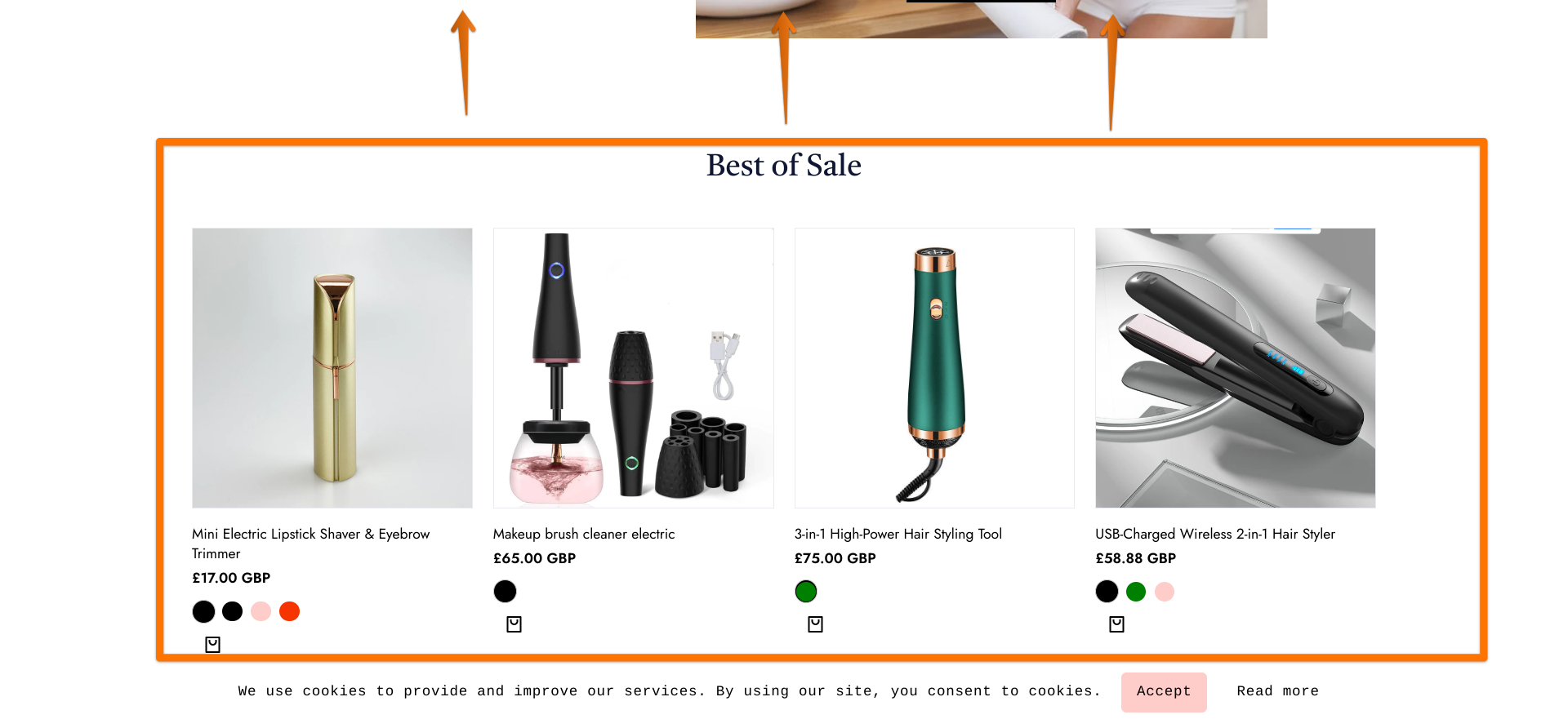 Toujours sur l’aspect visuel, je vous recommanderais de placer votre partie Best of sale un peu plus haut pour mettre en valeur vos produits :