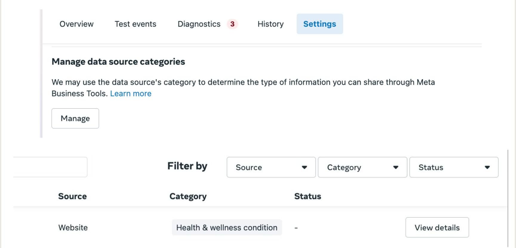 To check your categorization, head on over to Events Manager > Data Sources > Then select your pixel > Settings… then scroll down and click on “Manage” under “Manage data source categories.”