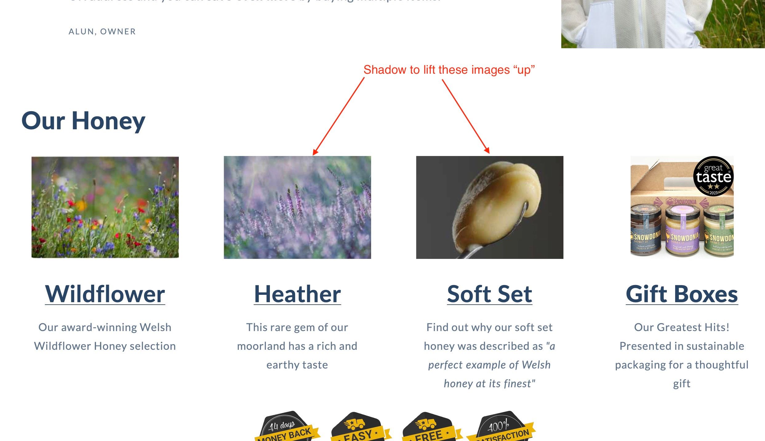Is this possible? I have a Multicolumn section with four columns, each with a picture and text. I’d like to raise the picture up by putting a lift shadow around it. Is this possible in Dawn? The website is at www.snowdoniahoney.com and its on the landing page.