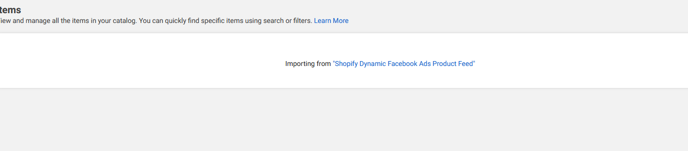 My Facebook Business Mnager SHowing "Importing from "Shopify Dynamic Facebook Ads Product Feed"