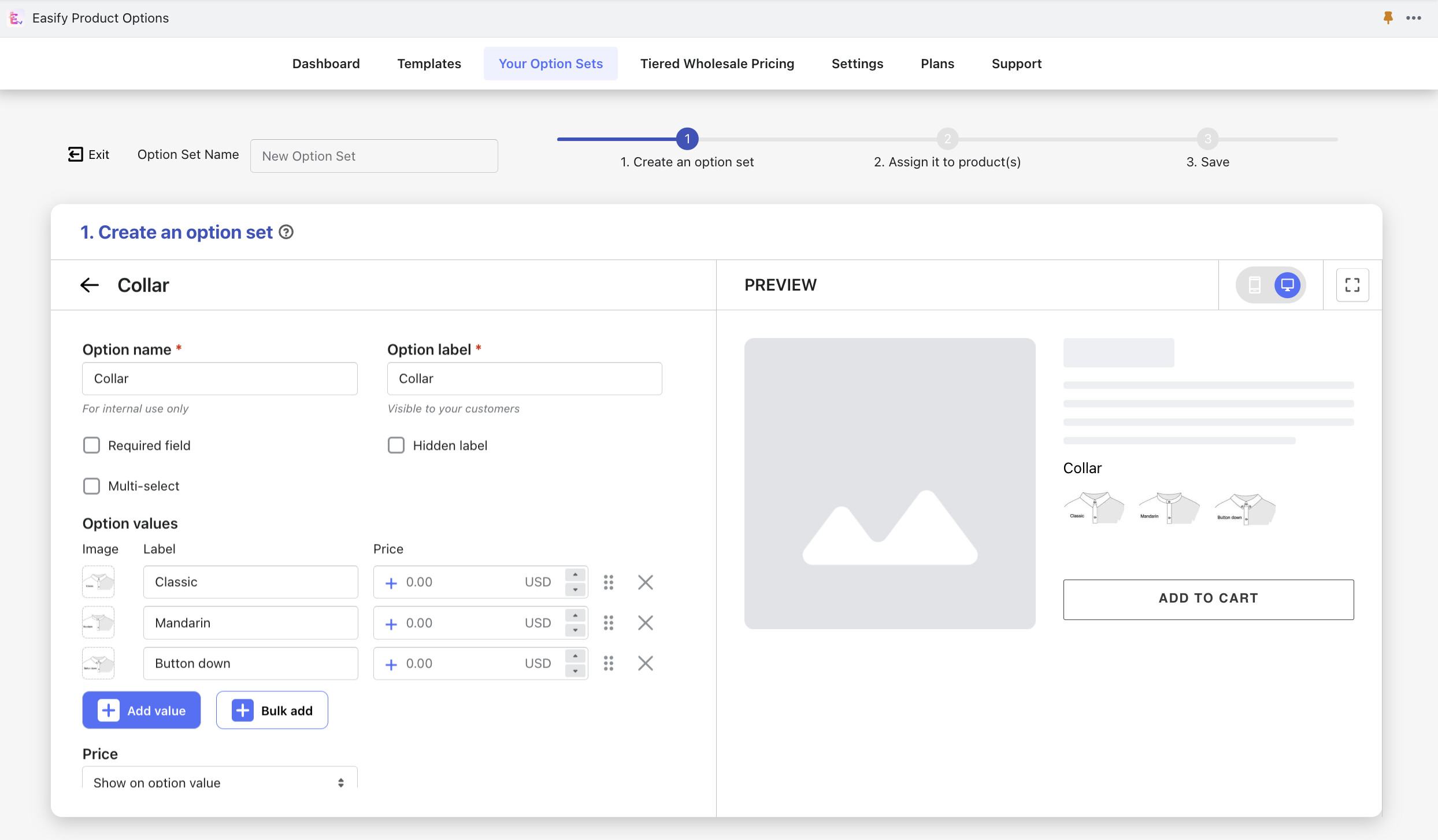 - Add Collar options and choose among the 24 option input types provided by the app, such as Image Swatches.