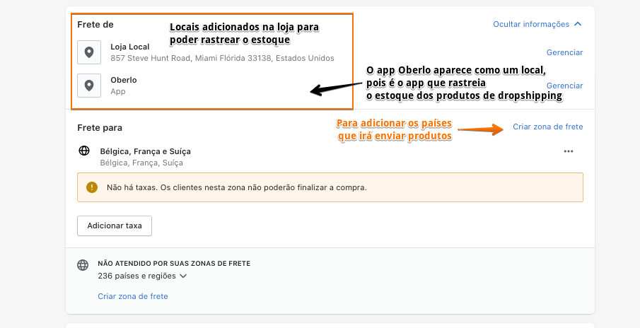 Clique em Criar zona de frete para adicionar os países que irá enviar produtos. No exemplo, as taxas serão as mesmas para os três países. Caso desejar criar taxas diferentes, basta criar uma zona de frete para cada país.