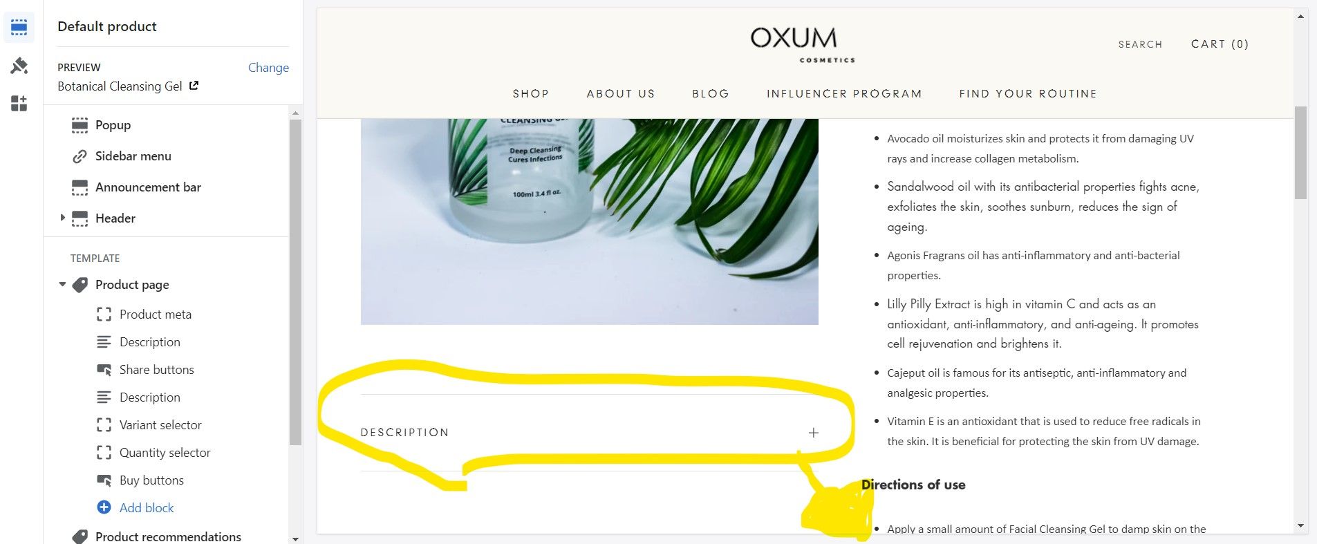 "content": "To show reviews, install [Shopify Product Reviews](https://apps.shopify.com/product-reviews). This content will show on the left part, below the product images. "