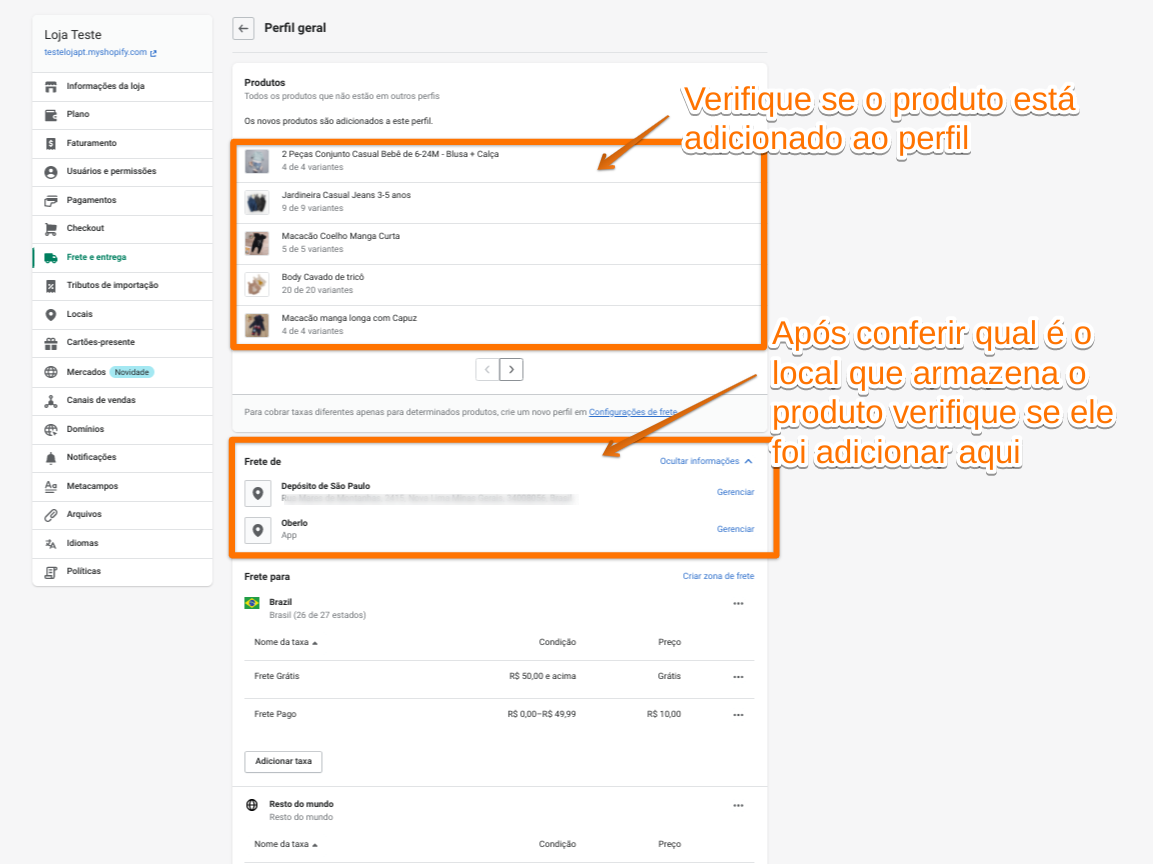 Poderá conferir isso indo em Configurações> Frete e Entrega e verifique se além das taxas de frete gerais você também tem taxas de frete personalizadas, como neste exemplo: