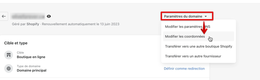 Choisissez le domaine en question ⇨ cliquez le menu déroulant “Paramètres du domaine” ⇨ Modifier les coordonnées: