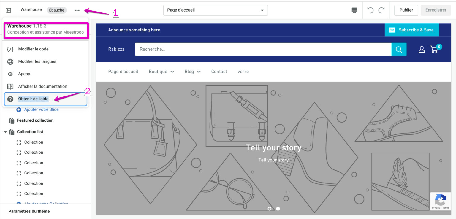 Si vous utilisez un thème tiers, vous devrez communiquer avec l’équipe de développeurs de ce thème. Pour connaître l’équipe de conception de ce thème et les contacter, rendez-vous à votre interface d’administrateur Shopify et cliquez sur Boutique en ligne > Personnaliser (bouton à côté de votre thème). Il y a trois points en haut à gauche de votre page d’éditeur de thème. Cliquez sur ce bouton puis sur ‘‘Obtenir de l’aide’’ pour être redirigé à leur page de contact (voir image en bas pour un exemple).