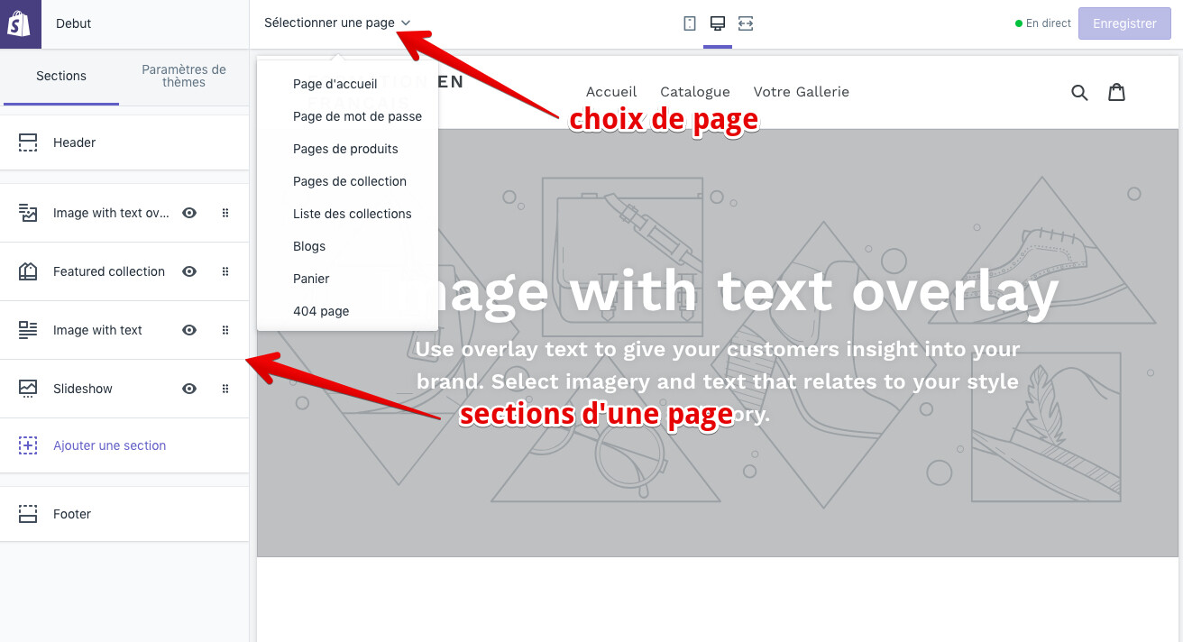 Lorsque vous allez dans la personnalisation de votre thème, vous devriez voir les choix de page dans le haut à gauche et les sections dans la barre latérale de gauche.