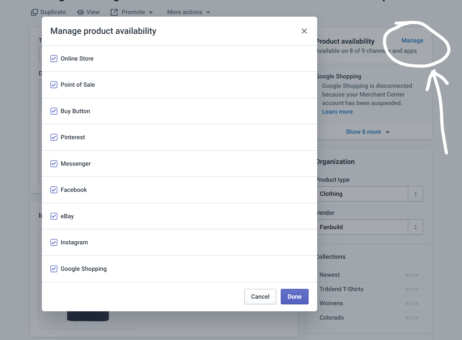 I have to manually click each product and click “manage” (shown on screenshot above) and click each sales channel and click save. By default every single product is not checked.