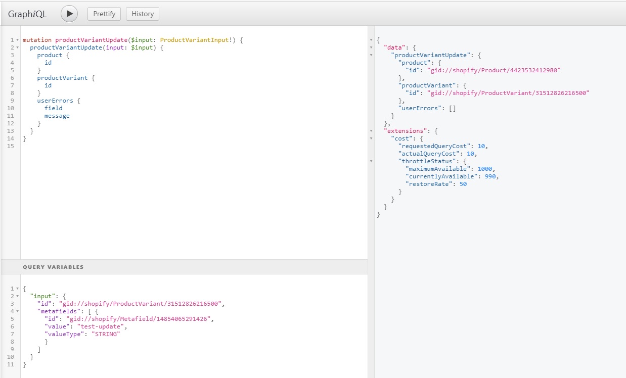 I realize now that what you’re trying to do is update the value of an existing metafield on a product, which cannot actually be done with the mutation we are using here. Instead, we should be using the privateMetafieldUpsert mutation instead. Take a look at the tutorial I have linked here. That should give you the information you need to update the product.