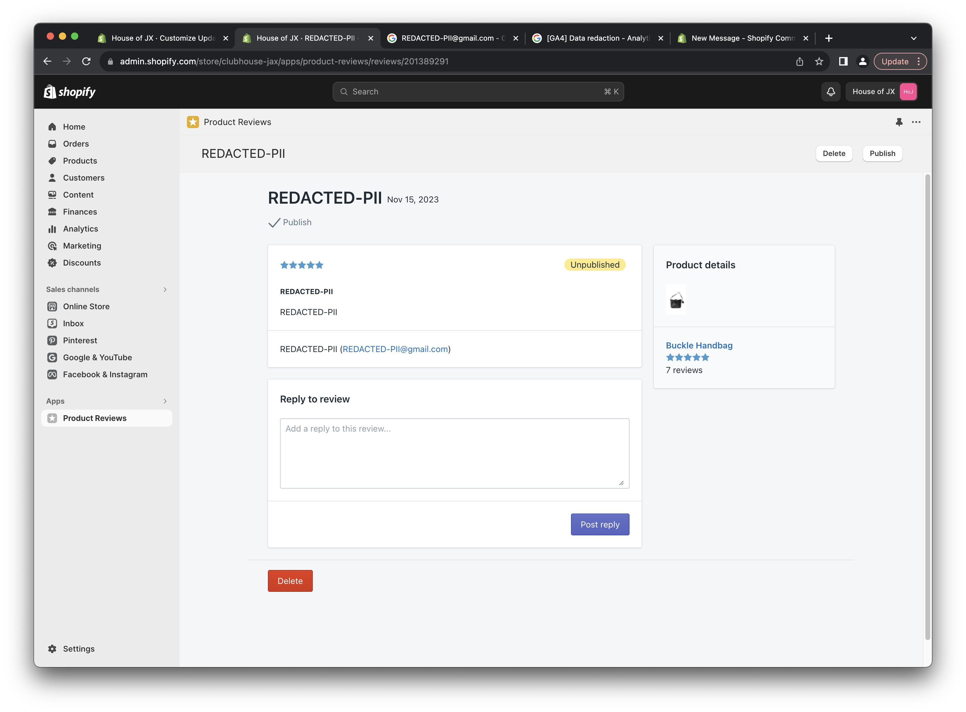I use the Shopify Product Reviews app. Product reviews that had previously been published have been automatically redacted and unpublished by the app and I am unable to manually republish them. Why are they being auto-redacted and how do I fix this?