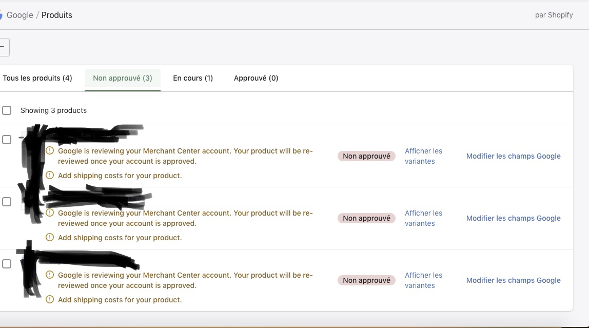 Je vais utiliser Google Ads pour la 1ère fois j’ai lié mes produits à Shopify mais ils ne sont pas approuvés.Je ne comprends pas la procédure à suivre. On m’indique que google examine mon compte Merchant Center et que je dois ajouté mes couts de livraisons alors que je les ai déjà programmé. J’ai ajouté ces produits le 28 novembre, j’ai contacté Google mais je n’ai toujours pas réponse. J’ai mis une capture d’écran qui indique mon problème. Merci de votre aide.