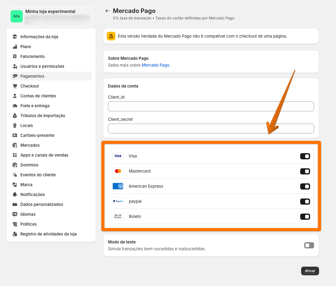Entendo que você está utilizando o checkout de 3 páginas, mas, mesmo assim, não consegue ativar o Mercado Pago, certo? Recomendo entrar em contato diretamente com o suporte do provedor para solicitar ajuda. É possível que você esteja enfrentando dificuldades para ativá-lo devido a alguma configuração que precisa ser feita do lado deles e que ainda não tenha sido concluída. Portanto, é importante entrar em contato com a equipe do Mercado Pago para que eles possam analisar a situação e verificar também se suas credenciais estão válidas.